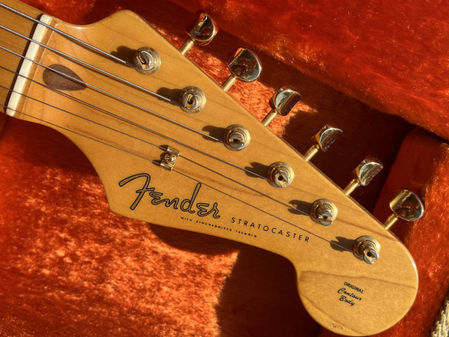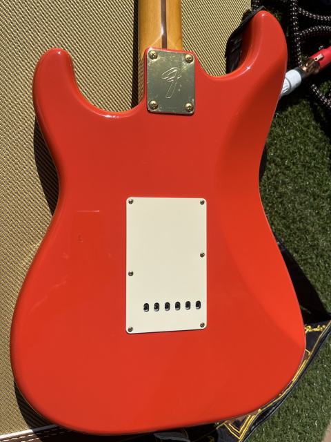 The guitar features genuine Hank Marvin Pickups by Kinman, Gotoh tuners, Fender bridge with Hank Marvin Tremolo, Fender six saddle Stratocaster bridge, fiesta red alder body, 21 fret maple neck, all hardware is gold. Included is it’s original Fender vintage tweed hard case.